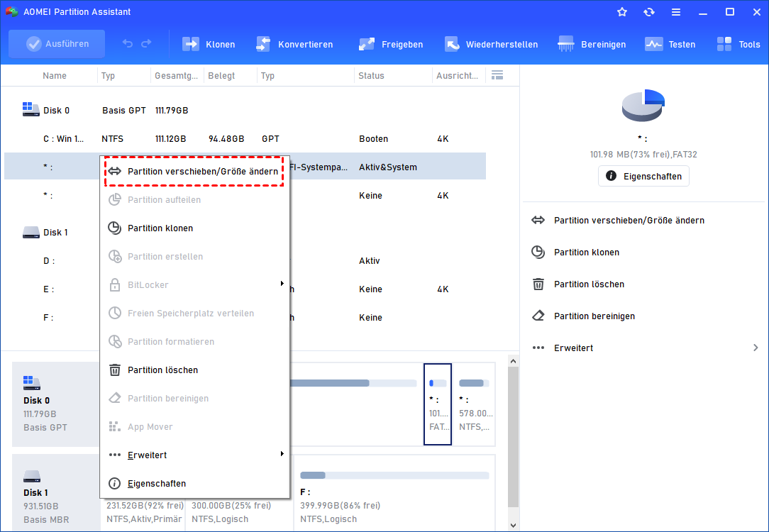 Schritt 5. Klicken Sie mit der rechten Mäuse auf die System reservierte Partition und wählen Sie Partition verschieben/Größe ändern noch einmal.