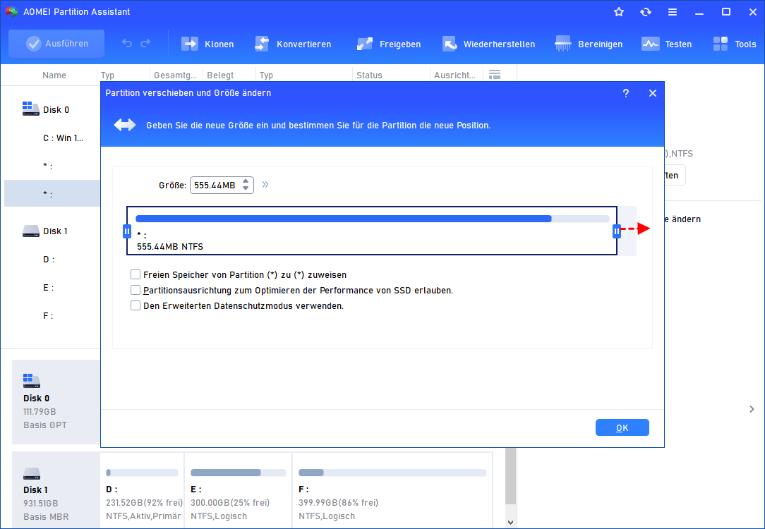Schritt 3. Aktivieren Sie im Pop-up-Fenster das Kontrollkästchen: Ich muss diese Partition verschieben. Und ziehen Sie den Schieberegler von links nach rechts. Danach klicken Sie auf OK.