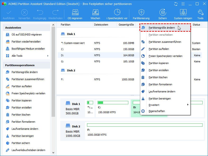 Schritt 1: Klicken Sie mit der rechten Maustaste auf das Volume, die Sie schrumpfen müssen, und wählen Sie "Partition verschieben/Größe ändern".