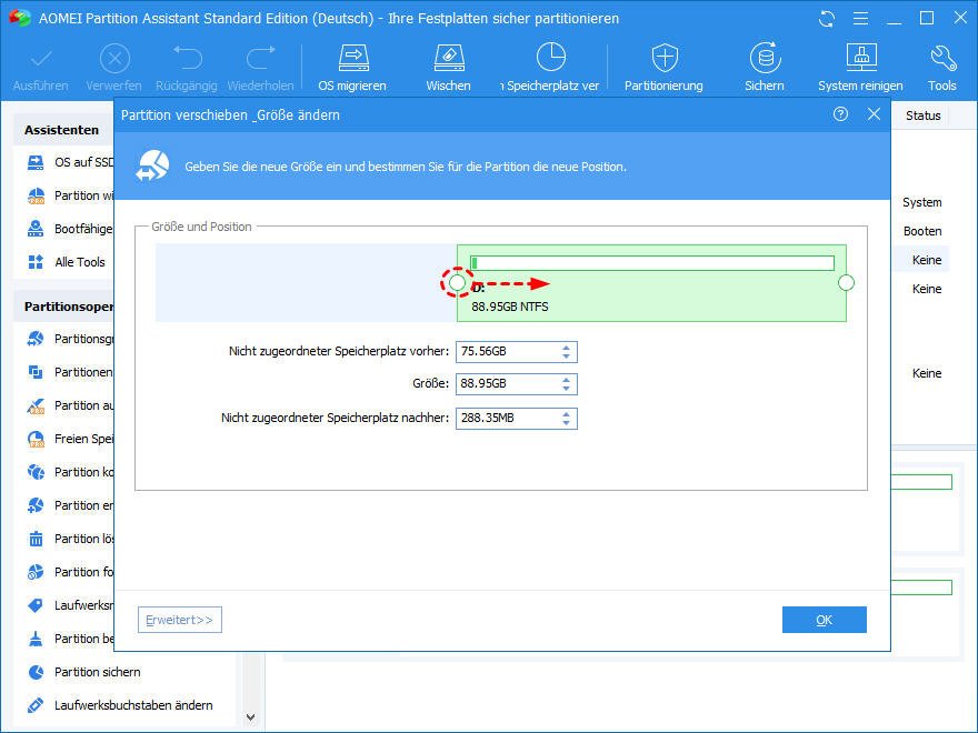 Wie schrumpft man Volume in Windows 7 mit AOMEI Partition Assistant?