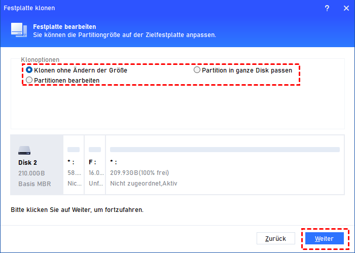 Wie oben erwähnt, haben unterschiedliche Klonmethoden unterschiedliche Anforderungen an den nicht zugeordneten Speicherplatz. Sie können die geeignete Methode auswählen, abhängig von der Größe des nicht zugewiesenen Speicherplatzes auf Ihrer Zielfestplatte.