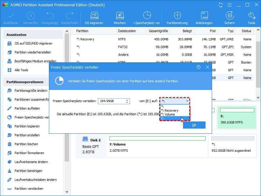 Daher wird empfohlen, eine Partitionsverwaltungssoftware, AOMEI Partition Assistant Professional, zu verwenden, um Speicherplatz direkt von einer anderen Partition zum Laufwerk C zuzuweisen.