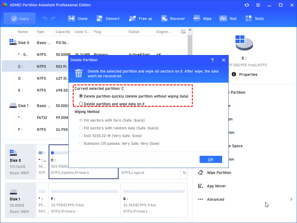 Step 2. In the pop-up window, choose “Delete partition quickly without wiping data” or “Delete partition and wipe data on it”. Then, click “OK”.