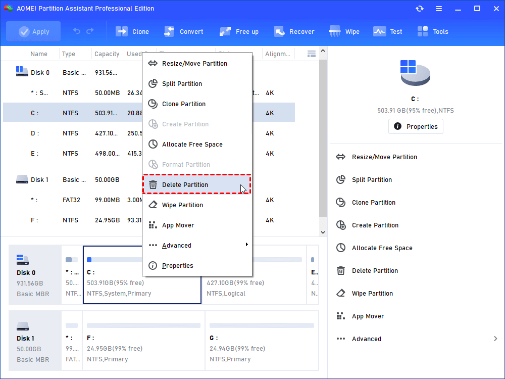 Whether you want to delete system partition, EFI partition, or partition on a USB flash drive, you can turn to a great tool for disk and partition management, AOMEI Partition Assistant Professional. It is an easy-to-use GUI tool and very suitable for a green hand in computer knowledge. Now, see how to use it to delete partition in Windows 10/8/7/XP and Vista.