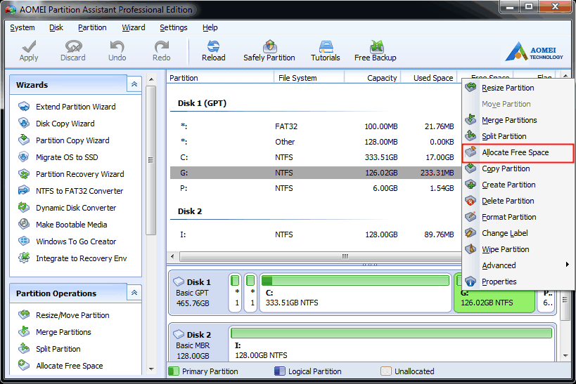 1. Right-click the partition which has redundant space, and then click “Allocate Free Space”.