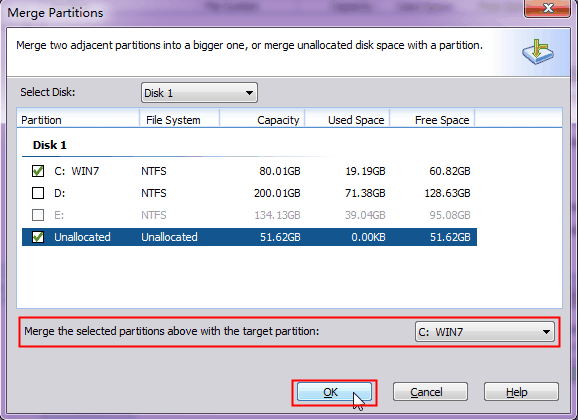 2. In the pop-up window, check C drive and the unallocated space and then click “OK”.