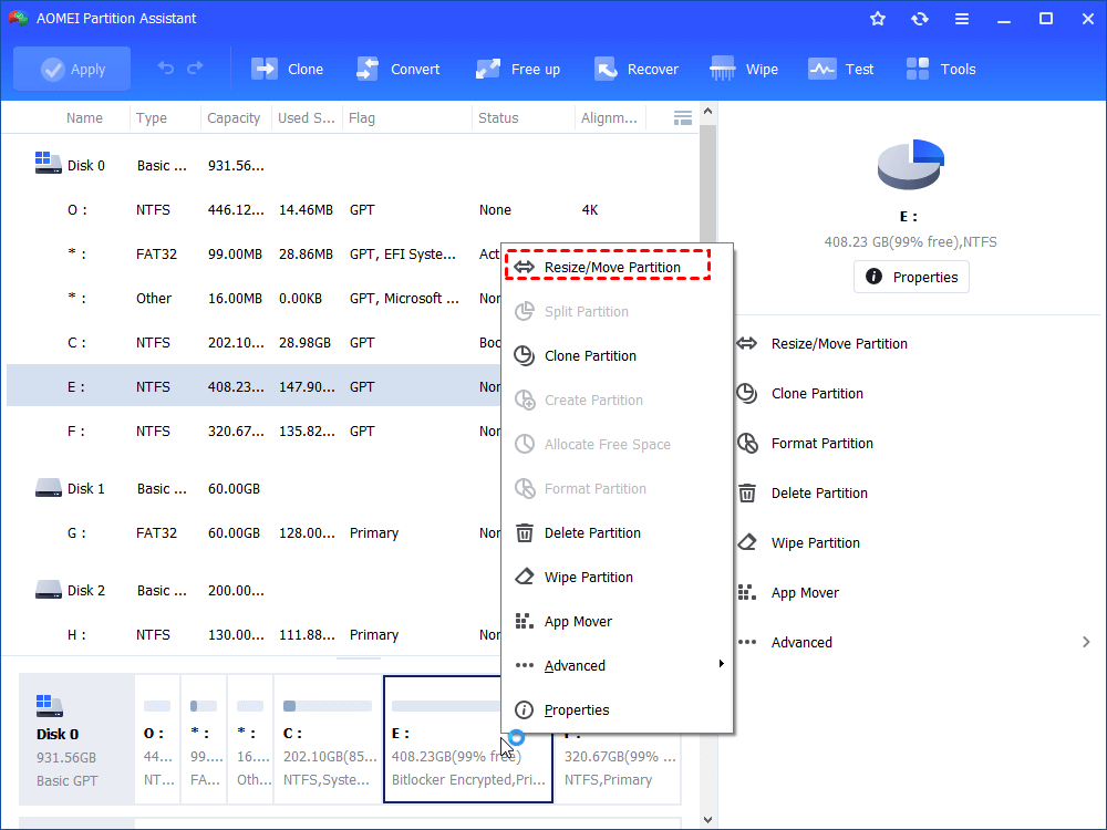 Step 1. Open AOMEI software and right-click the BitLocker encrypted partition and select "Resize/Move Partition".