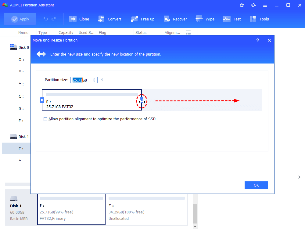 Step 3. Drag the bar towards the right to extend the partition, and click on "OK" to continue. Then, follow the steps to complete the operation.