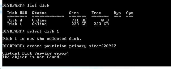 “I initialized it to MBR when it was first recognized by Windows. I’d like to create a primary partition on my 250 GB hard drive. In Diskpart, I typed these commands to create partition: list disk > select disk 1 > create partition primary size=228937. And then I get the error message says Virtual Disk Service error: The object is not found in Diskpart as the following picture shows. Why can’t I create a partition on that disk? What’s the simplest method to solve this issue?”