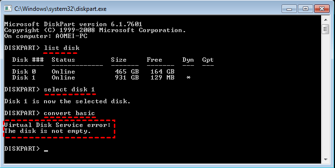 Sometimes, you may receive virtual disk service error: the disk is not empty. This is because you mistakenly convert basic disk to dynamic disk and want to get it back.