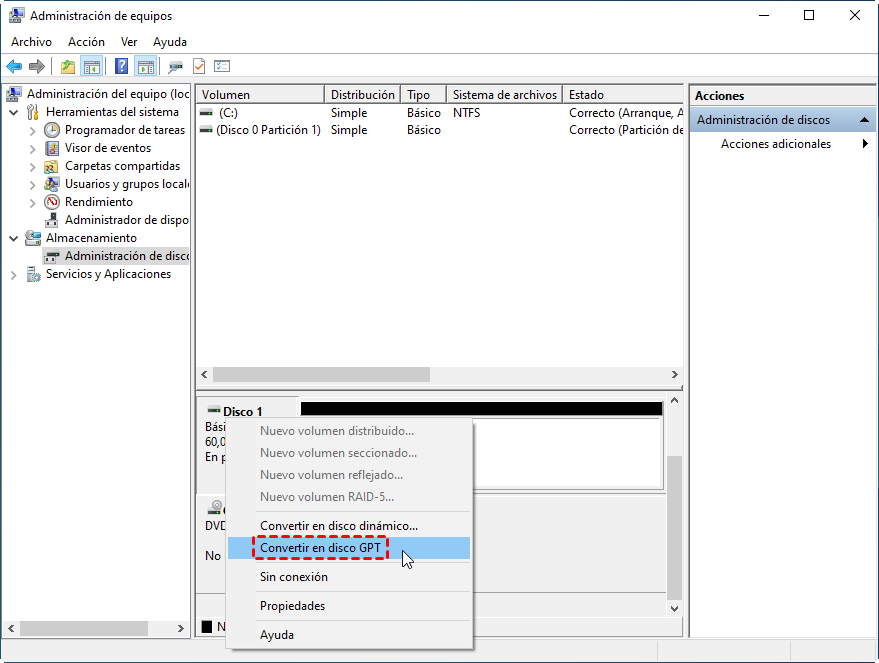 Consejos: después de limpiar el disco, puede inicializarlo en GPT en Administración de discos directamente.