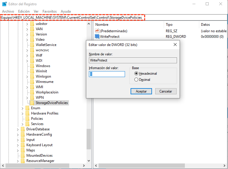 Un valor incorrecto en la clave del Registro de Windows puede ser otra razón por la que su SSD esté protegida contra escritura. Siga estos pasos e intente restablecer el valor de datos en el Editor del Registro para eliminar la protección contra escritura.