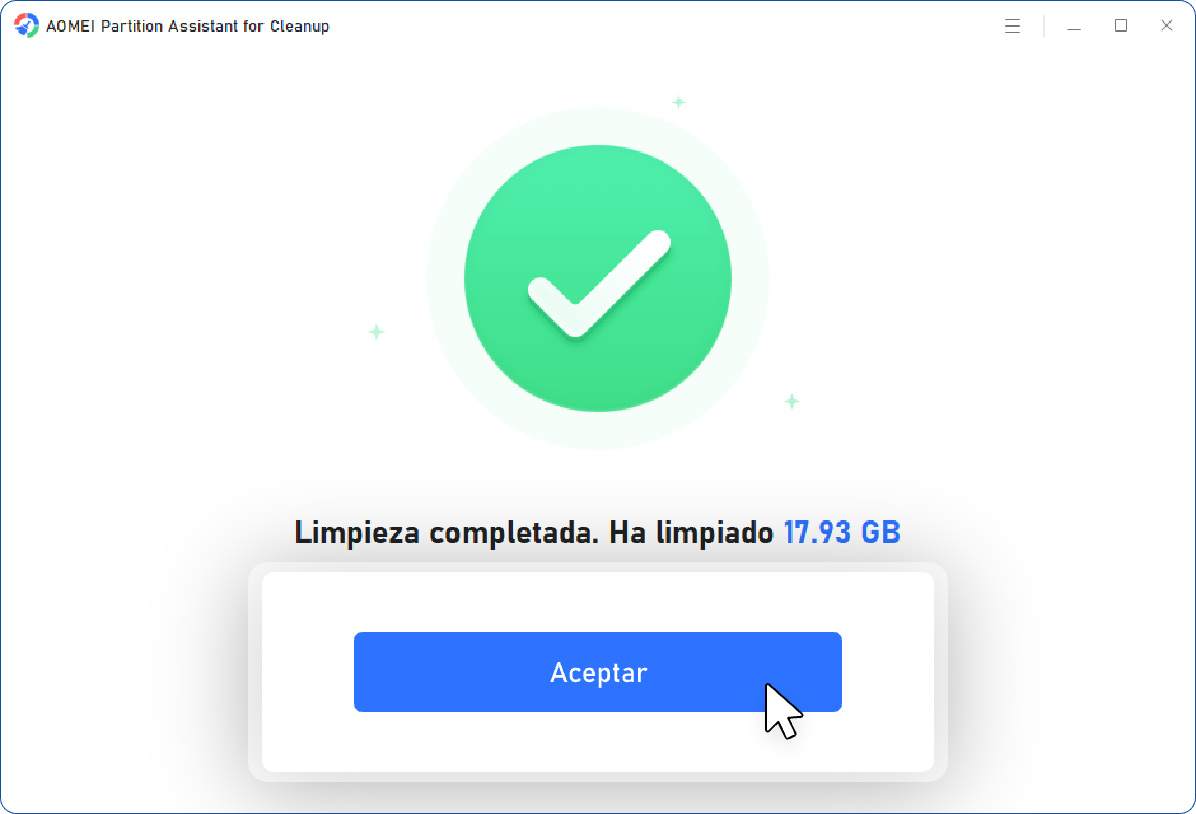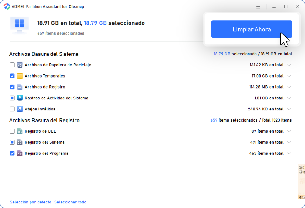Con AOMEI Partition Assistant for Cleanup, puede limpiar archivos basura de forma segura. El software escanea y lista solo elementos seguros para eliminar, como archivos temporales, cachés y registros del sistema; sus archivos personales nunca se tocan.