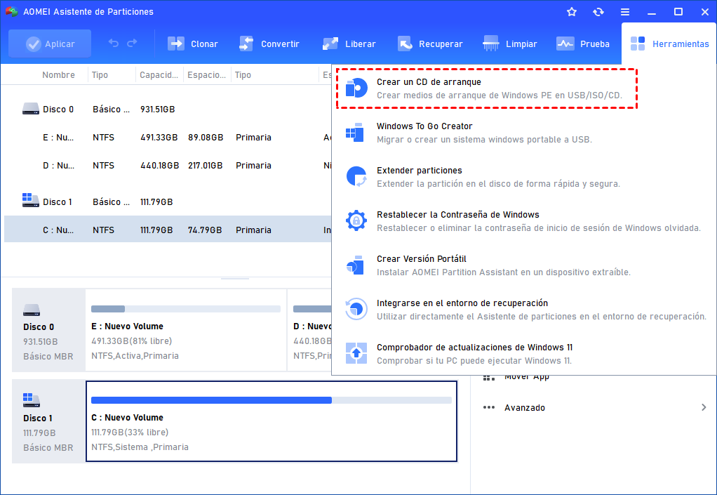 Paso 1. Instale y ejecute AOMEI Partition Assistant Professional en un equipo en funciones. En la interfaz principal, haga clic en Herramientas > Crear un CD de arranque en el panel y siga el asistente para crear un medio de arranque de Windows 10/8/7.