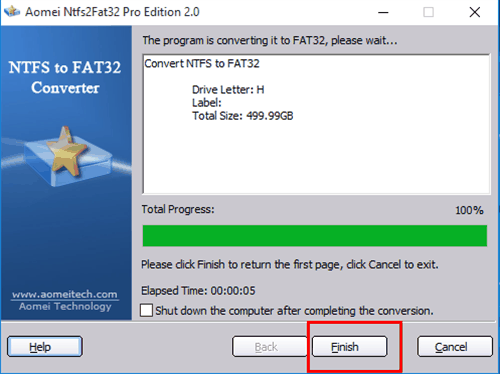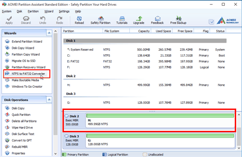 To do so, we recommend you a free and powerful software - AOMEI Partition Assistant, which has the advantage that converting NFTS to FAT32 without data loss. With intuitive interface of it, anyone can easily achieve job in few simple steps.