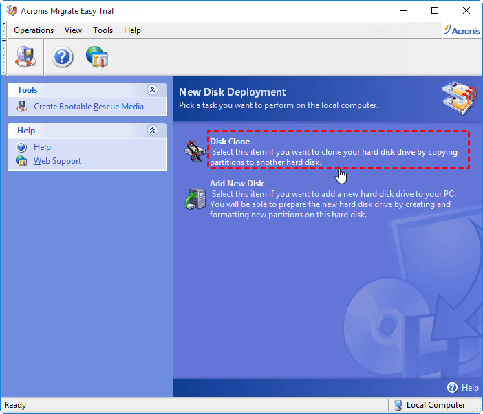 Acronis Migrate Easy est une application qui vous permet de cloner votre ancien disque dur sur un autre avec la fonction « Disk Clone ». Il peut migrer toutes les données, systèmes d'exploitation, programmes, paramètres et tout le reste d'un disque à un autre. En outre, sa fonction « Add New Disk » peut aider les utilisateurs à déployer rapidement et facilement un nouveau disque dur sur leur PC ou ordinateur portable en créant et en formatant de nouvelles partitions sur le nouveau disque dur.