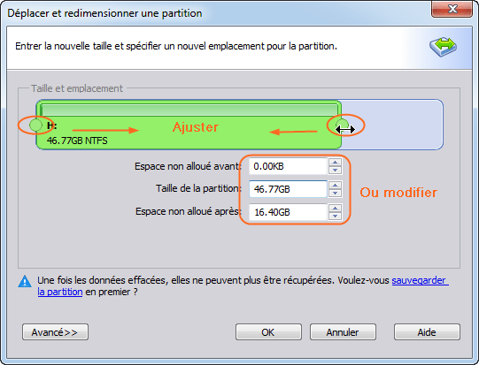 Redimensionner la partition : Si vous placez la souris sur la bordure de la partition, une flèche bidirectionnelle apparaît (↔) et vous pouvez agrandir (lorsque l'espace non alloué est à côté de la partition que vous souhaitez étendre) ou réduire la partition en déplaçant la bordure.