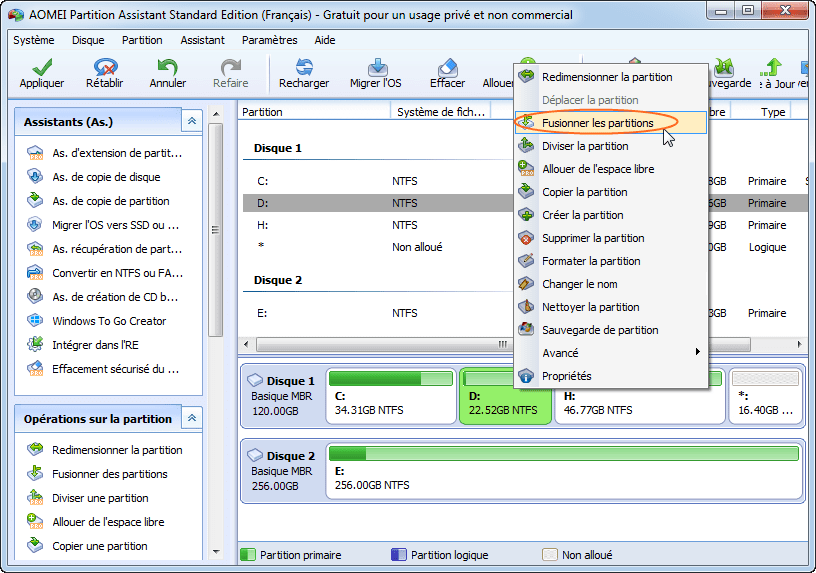 AOMEI Partition Assistant Standard est un logiciel professionnel conçu pour la gestion de partition de disque dur sous Windows 7/8/10/11/XP. Il offre les fonctionnalités Redimensionner la partition, déplacer la partition et fusionner les partitions pour vous aider à modifier la taille et la position des partitions. Et toutes ces opérations ne causeront pas de perte de données.
