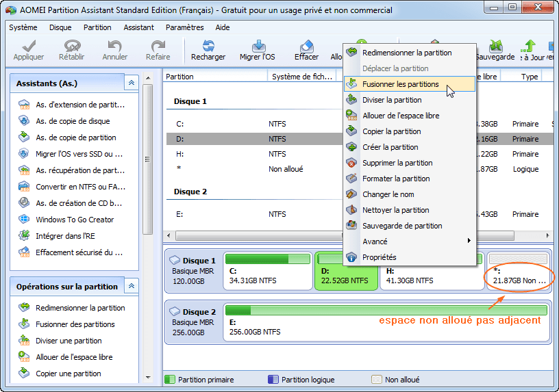 S'il y a pas d'espace non alloué, vous pouvez réduire une autre partition qui possède encore beaucoup d'espace libre pour en générer, ou directement fusionner la partition et une autre partition à l'aide de AOMEI Partition Assistant.