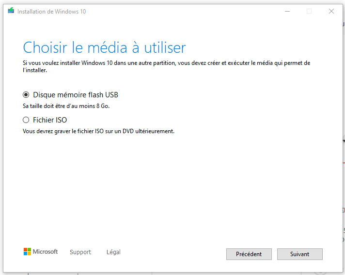 1.1 : Téléchargez Windows Media Creation Tool, lancez-le et choisissez Créer un support d'installation (clé USB, DVD ou fichier ISO) pour un autre PC et cliquez sur Suivant.