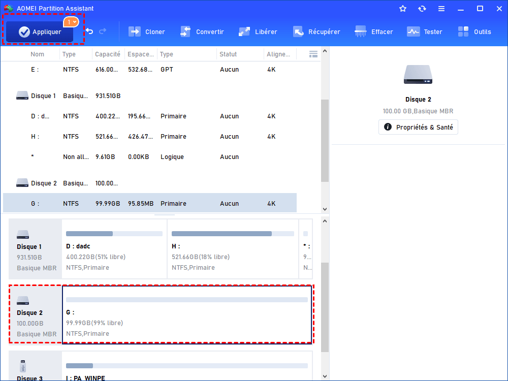 3. De retour à l'interface principale, cliquez sur Appliquer puis Exécuter pour valider l'opération en attente.