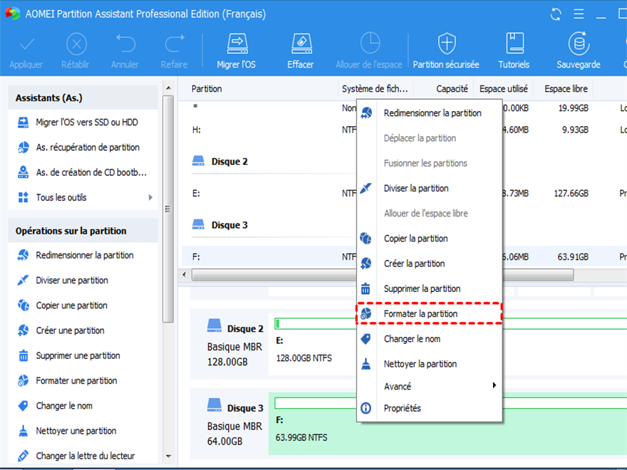 Utiliser un logiciel tiers pour changer la taille de bloc / cluster de 4K à 64K devrait être le moyen le plus simple. AOMEI Partition Assistant Standard est un logiciel gratuit très facile à utiliser qui peut vous aider à formater une partition pour changer la taille du cluster de 4K à 64K sans perte de données.