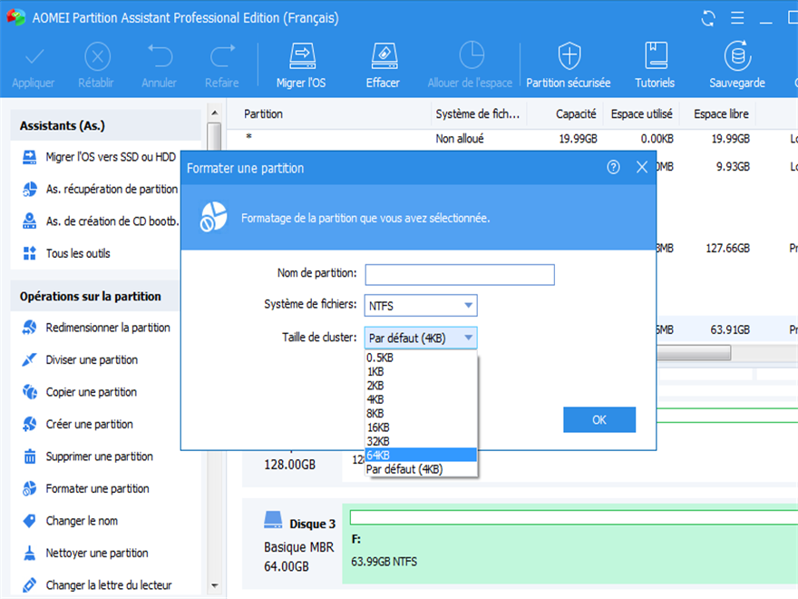 Formatez la partition pour changer la taille du cluster de 4K à 64K avec AOMEI Partition Assistant