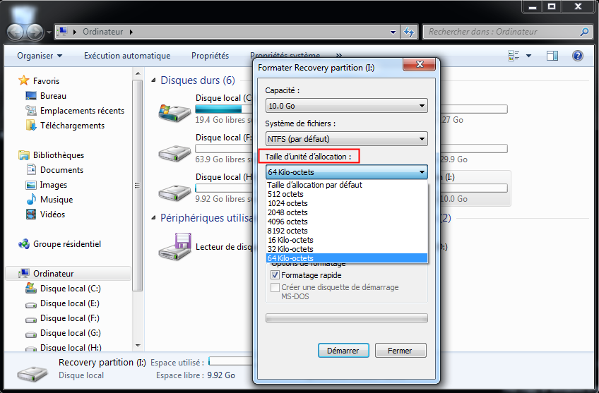 2. Dans la boîte de dialogue Formater, cliquez Taille d'unité d'allocation, sélectionnez 64 Kilo-octets, et sélectionnez Formatage Rapide, et cliquez Démarrer.