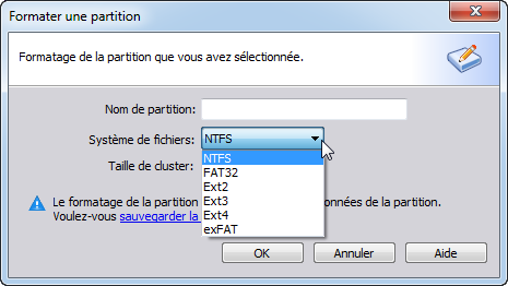 Étape 2. Une petite fenêtre s'ouvrira, vous pouvez y définir le système de fichiers de la partition, de modifier la taille du cluster et de modifier le nom de partition. Ensuite, cliquez sur OK.