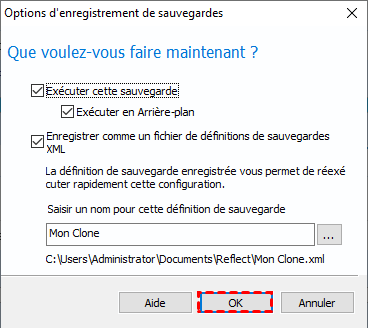 Étape 8. Une fenêtre s'affichera avec les options « Exécuter cette sauvegarde » ou « Enregistrer comme un fichier de définition de sauvegardes XML ». L'enregistrement du clonage en tant que fichier de définition de sauvegarde permet de réexécuter facilement le même clonage à l'avenir. Enfin, cliquez sur « OK ».