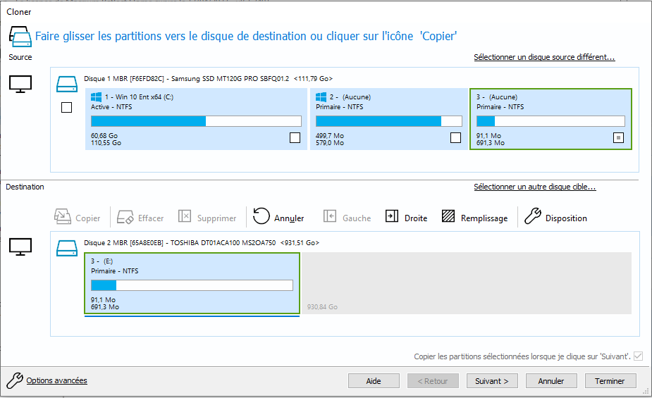 Étape 4. Vous pouvez faire glisser des partitions individuelles du disque source vers la destination. Les partitions peuvent être déplacées vers leur destination dans n'importe quel ordre.