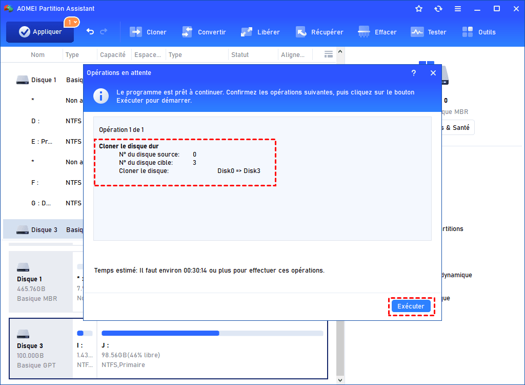 Étape 5. Vous arrivez à l'étape de Confirmation. Veuillez vérifier si le disque source et disque cible sont correctes. Vous pouvez voir qu'il y a 3 options en bas de la fenêtre.