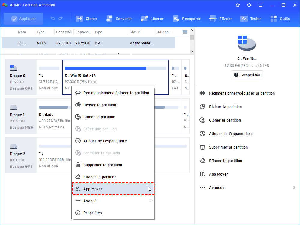 Étape 1. Installez et lancez AOMEI Partition Assistant Professional. Faites un clic droit sur le disque C et choisissez APP Mover.