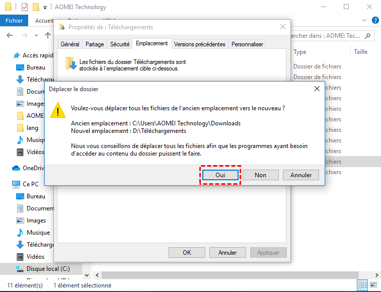 Étape 7. Une boîte de dialogue Déplacer le dossier apparaît en vous demandant si vous souhaitez déplacer tous les fichiers de l'ancien emplacement vers le nouveau. Cliquez sur Oui et le dossier Téléchargements ainsi que tous les fichiers qu'il contient seront immédiatement déplacés vers le disque de destination.
