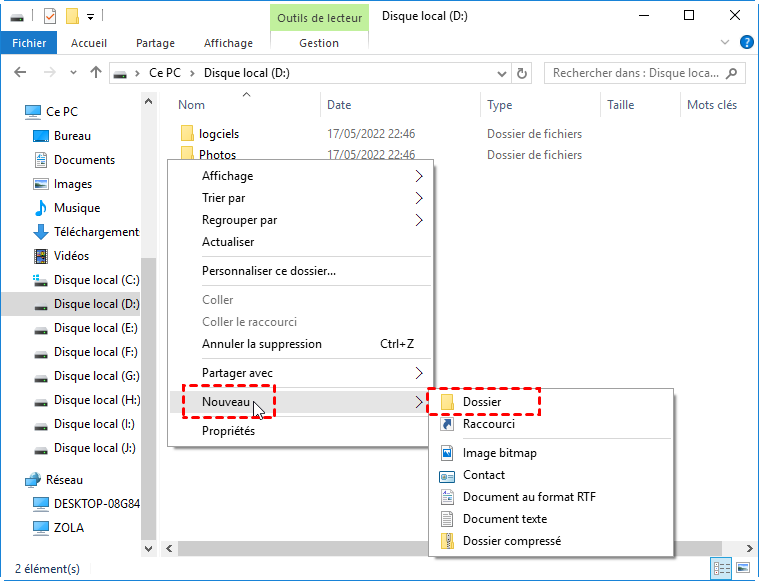 Étape 2. Ouvrez le disque de destination vers lequel vous souhaitez déplacer le dossier Téléchargements, tel que le disque D. Dans le répertoire racine du disque, faites un clic droit sur la zone vide et sélectionnez Nouveau > Dossier pour créer un nouveau dossier Téléchargements.
