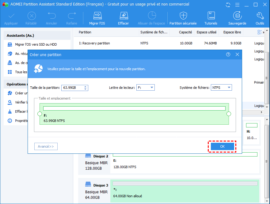 AOMEI Partition Assistant Standard sera mon premier choix, il est compatible avec Windows 10/8/7, XP et Vista. Ce gestionnaire de partition puissant et fiable vous permet de formater un disque non alloué en FAT32, NTFS, exFAT, Ext2, Ext3 et Ext4, afin que votre disque puisse fonctionner avec différents systèmes d'exploitation et périphériques électroniques. Il vous soutient à formater une grande partition de 64 Go en FAT32 et créer une deuxième partition sur la carte SD ou un lecteur flash USB. En outre, avec une interface intuitive, il est facile à manipuler même pour un novice en informatique. Examinez comment cela fonctionne (prenez le formatage d'un disque non alloué en NTFS dans Windows 10 comme exemple).