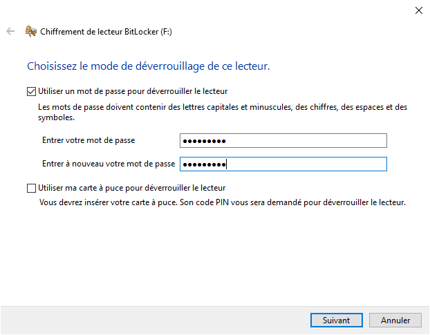 2. Ici, choisissez le mode de déverrouillage pour le lecteur sélectionné. Par exemple, on utilise le mot de passe.
