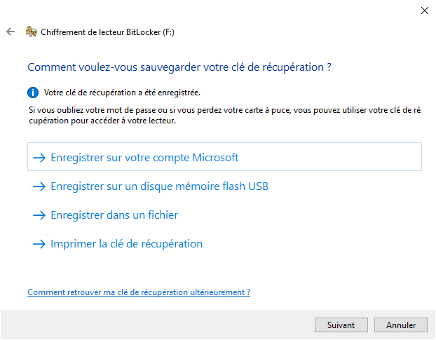 3. Choisissez où vous souhaitez sauvegarder la clé de récupération. Vous pouvez la sauvegarder sur votre compte Microsoft, enregistrer un fichier de sauvegarde ou imprimer la clé.
