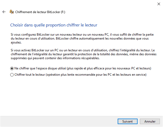 - Ne chiffrer que l'espace utilisé (rapide et optimal pour les nouveaux PC/lecteurs) : Coché par défaut. Si vous mettez en place BitLocker sur un nouveau PC ou un nouveau lecteur, vous n'avez besoin de chiffrer que la partie du lecteur actuellement utilisée. De plus, BitLocker chiffre automatiquement les données nouvellement ajoutées.