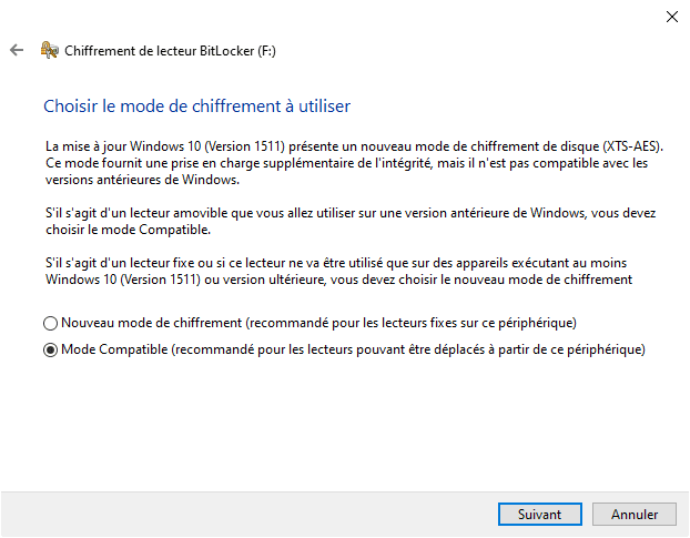 - Chiffrer en mode compatible (convient aux lecteurs de données amovibles) : Coché par défaut. Windows 10 (version 1511) introduit un nouveau mode de chiffrement du disque (XTS-AES). Ce mode offre une prise en charge de l'intégrité renforcée, mais il n'est pas compatible avec les versions antérieures de Windows.