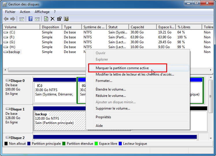 NTFS est le système de fichiers et vous pouvez le changer en FAT32. Le «backup» est une étiquette de partition qui peut également être modifiée. Maintenant, vous constaterez que le disque dur externe a une partition formatée avec NTFS et nommée «backup» dans Gestion des disques. Si vous souhaitez l'utiliser comme lecteur d'amorçage, cliquez avec le bouton droit de la souris sur la partition et marquez-la comme active.