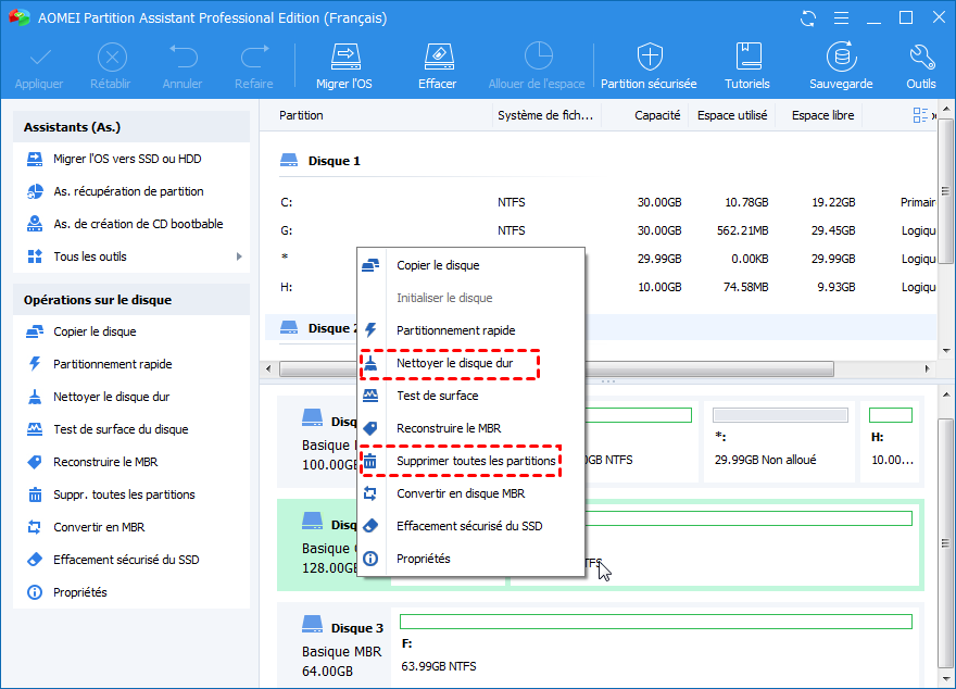 Heureusement, AOMEI peut nous aider à supprimer toutes les données d'un disque dur d'un seul coup avec la fonctionnalité Supprimer toutes les partitions. En plus de ça, il prend en charge le formatage de bas niveau. Si vous voulez supprimer les données du disque dur de manière pertinente, vous pouvez utiliser la fonctionnalité Nettoyer le disque dur.