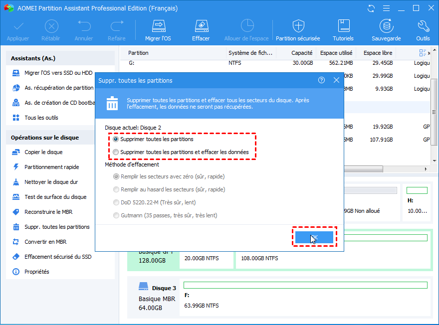 *Supprimer toutes les partitions : vous pouvez choisir de supprimer uniquement les partitions ou supprimer toutes les partitions et effacer les données en même temps.