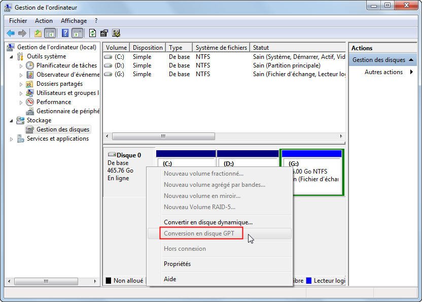 Maintenant nous allons vous présenter 3 solutions pour convertir le disque de base en disque GPT quand l’option Conversion en disque GPT est grisée.