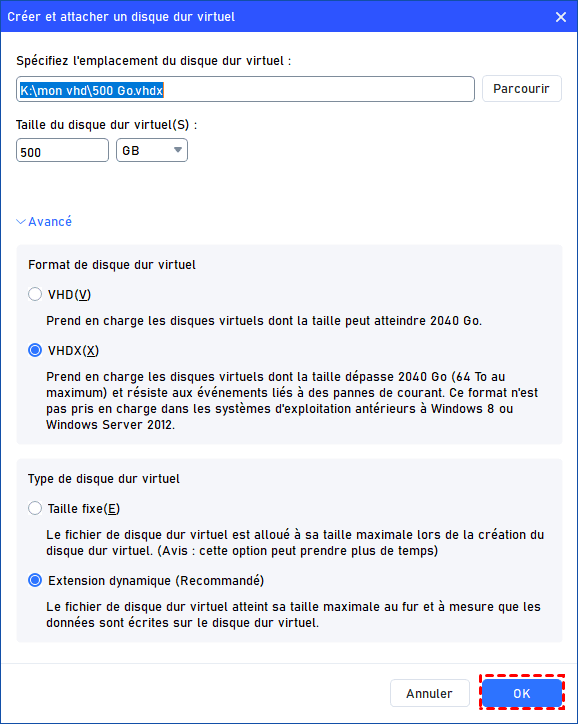 Étape 3 : Une fois l’emplacement et la taille du disque virtuel définis, cliquez sur « OK » pour commencer la création du VHD.