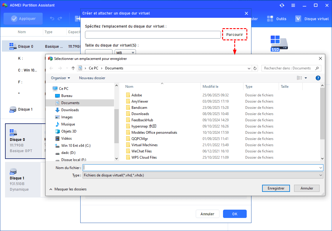 Étape 2 : Cliquez sur « Parcourir » pour choisir l’emplacement du VHD. Entrez un nom de fichier pour le disque virtuel, puis cliquez sur « Enregistrer ».