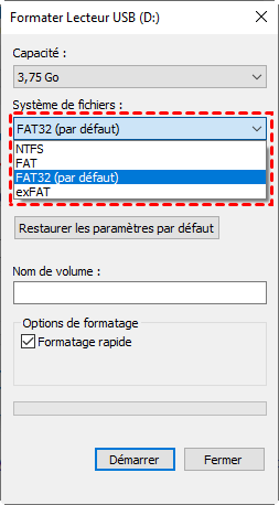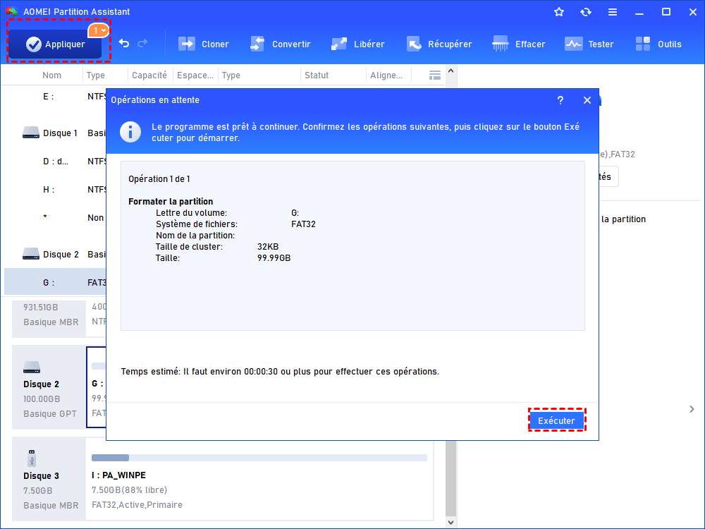Vous pouvez débooter la clé USB avec les 2 outils intégrés Windows mentionné ci-dessus, mais cela ne peut pas garantir le succès à chaque fois. Et le Diskpart ne peut pas formater une clé USB de plus de 32 Go avec le système de fichiers FAT32. De plus, si vous faites des erreurs lors de l’opération, vous ne pouvez annuler aucune étape immédiatement. Ainsi, vous feriez mieux de choisir un outil de formatage USB professionnel pour débooter la clé USB.