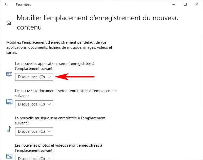 Étape 3. En dessous de « Les nouvelles applications seront enregistrées à l'emplacement suivant », vous pouvez sélectionner un disque dur comme emplacement d’installation par défaut du programme, puis cliquez sur « Appliquer ».