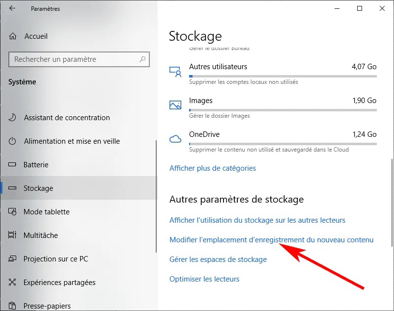 Étape 2. Cliquez sur « Stockage » à gauche, puis cliquez sur « Modifier l'emplacement d'enregistrement du nouveau contenu » sous « Autres paramètres de stockage » à droite.