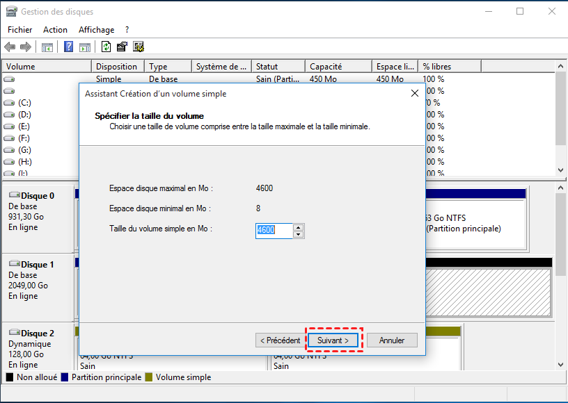 4. Remplissez « Taille de volume simple » à la valeur souhaitée en mégaoctets, puis cliquez sur « Suivant ». Notez la taille minimale et maximale autorisée lors de la création de la partition.
